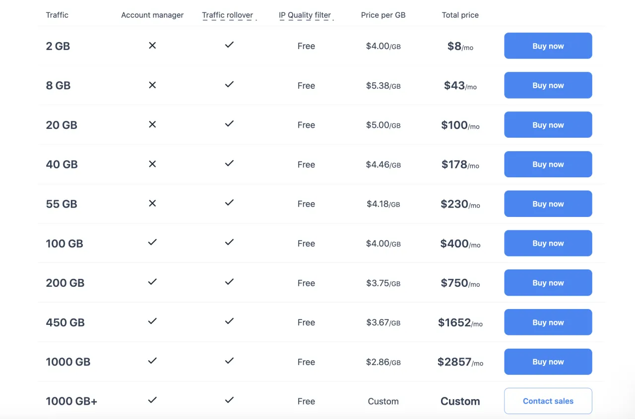 - يوفر بروكسيات موبايل وسكنية دوارة بتسعير يعتمد على حجم البيانات. كما تم مؤخرا طرح بروكسيات ISP ثابتة بتسعير لكل عنوان IP.