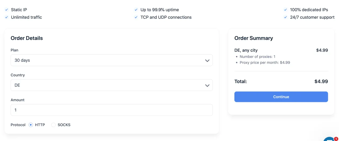 قبل البدء، يمكنك شراء تجربة لمدة 3.99 يورو لاختبار جودة البروكسي. مع التجربة ستحصل على 1 جيجابايت من المرور، الذي يمكن تخصيصه إما للبروكسيهات السكنية أو الجوال.