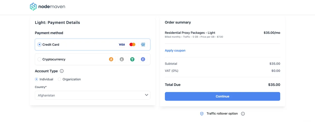 - يمكنك الدفع مقابل البروكسيات باستخدام العملات الرقمية أو البطاقة البنكية.