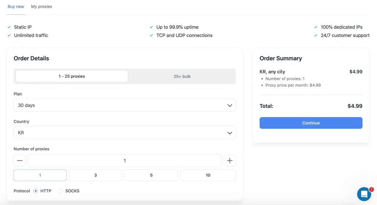 During checkout, you need to select the quantity, country, and protocol (HTTP or SOCKS5). After that, you can proceed with the payment. Once the payment is completed, the proxy details will be provided automatically and will appear in the "My Proxies" tab.