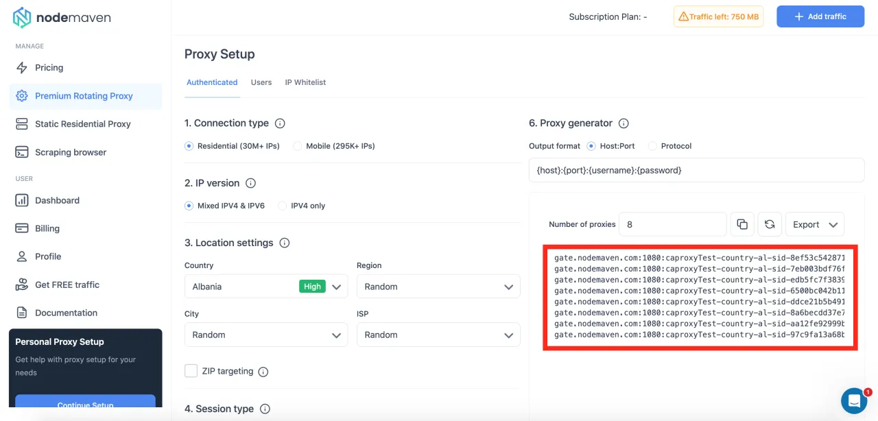 If everything is simple with ISP proxies and you are assigned ready-to-use credentials, rotating proxies need to be configured for proper operation. In NodeMaven, you can set up access to rotating proxies either through user authentication or by adding your IP address to a whitelist. Let’s look at setting up rotating proxies using user authentication (Login/Password), since this authorization method is used in 99% of cases.