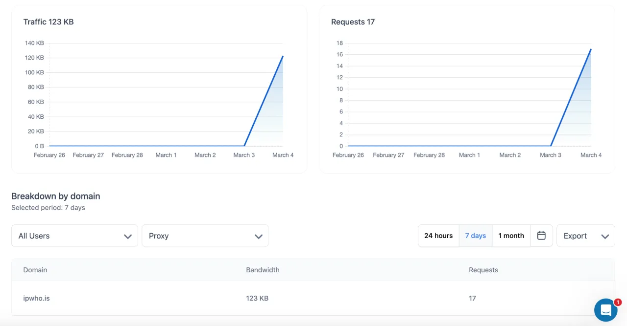In the NodeMaven dashboard, you can view proxy traffic usage statistics. You can filter by users and product, and also set the time period for displaying traffic usage statistics. You can also view detailed statistics on which domains the proxies were used on, how much traffic was consumed per domain, and how many requests were made.