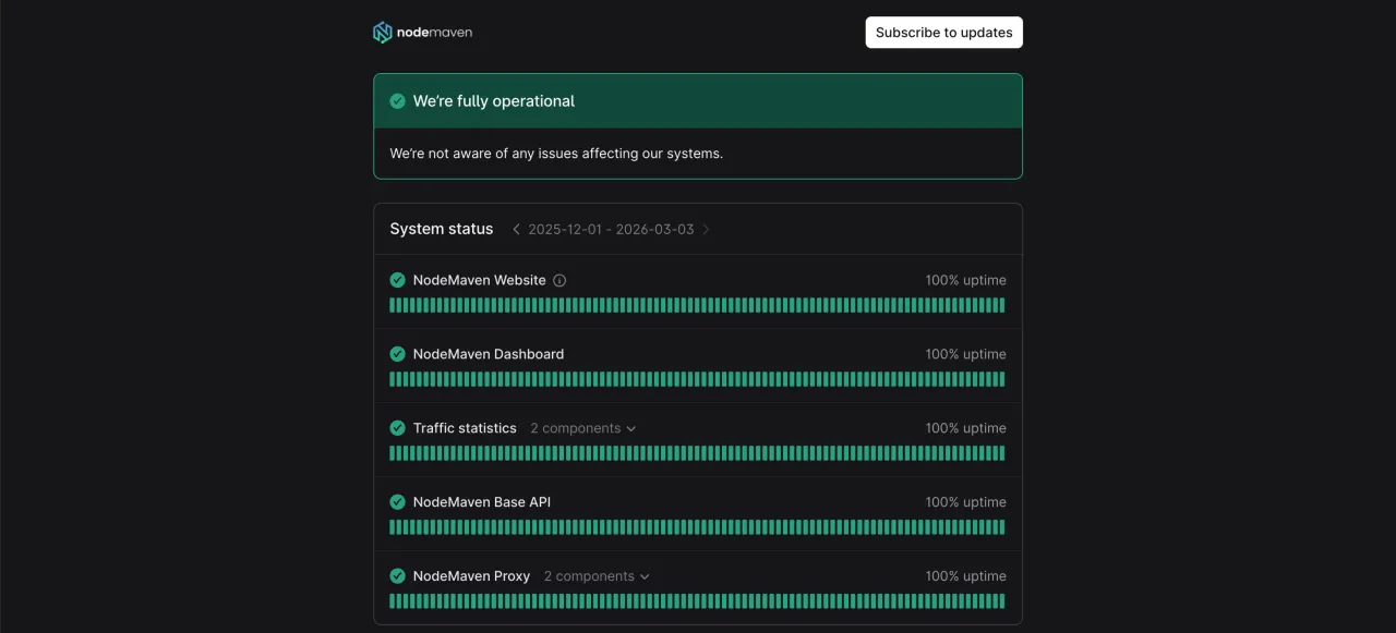 You can check in real time whether NodeMaven services (website, dashboard, API, statistics, proxy servers) are operating correctly. To do this, visit https://status.nodemaven.com/. This clearly increases user trust and allows you to understand whether their systems are functioning properly if you notice any anomalies.