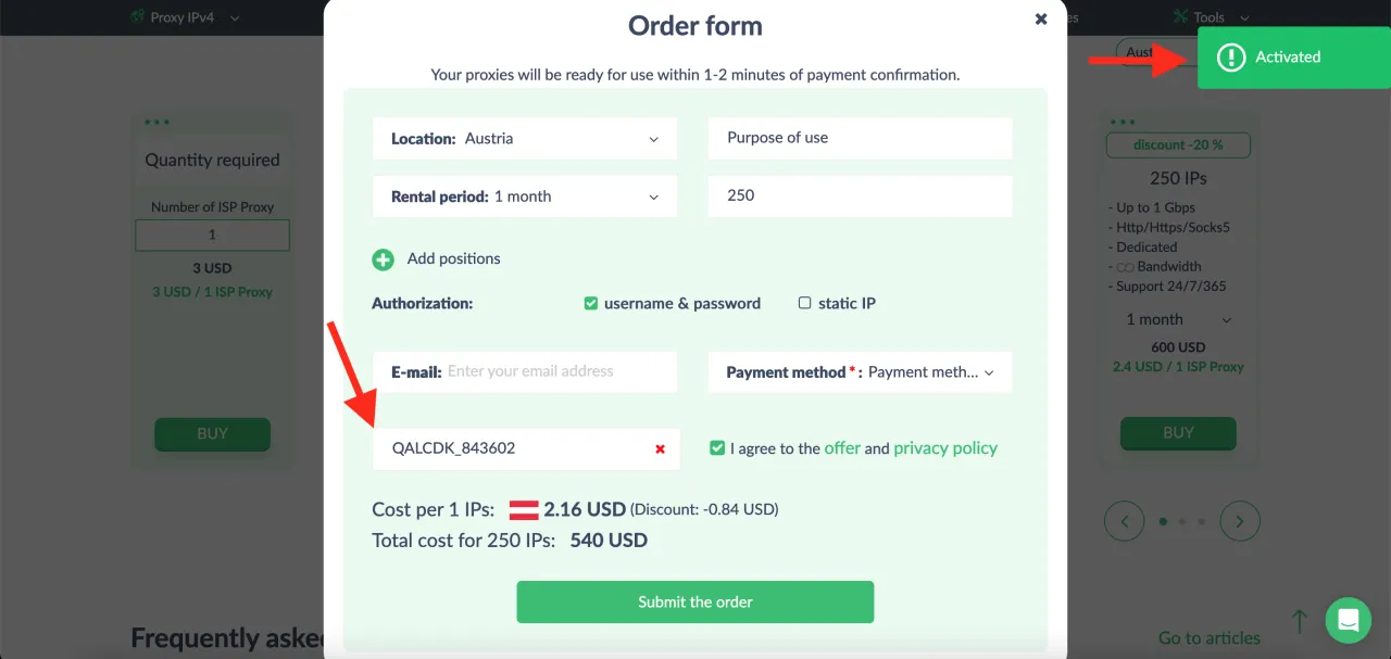 The process of applying a promo code on the Proxy-Seller website does not differ and is the same regardless of whether you have registered or not, and it is also identical for all types of proxies.