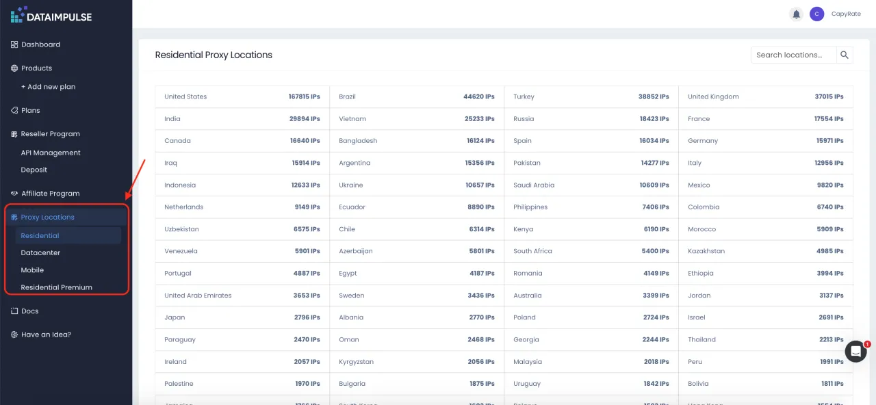 ¿Qué significa esto? Si necesitas una segmentación a nivel de país, puedes verificar el grupo de IP disponible de antemano para asegurarte de que DataImpulse puede satisfacer tus requerimientos.