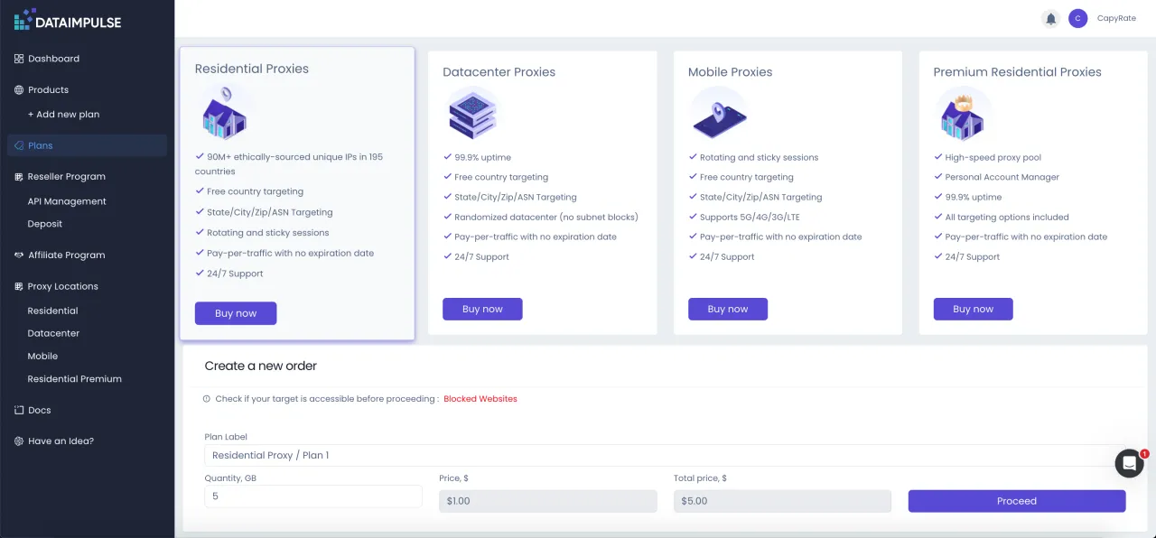La mayoría de los usuarios que necesitan proxies se sienten atraídos por DataImpulse principalmente por sus precios. La empresa ofrece precios muy bajos para proxies residenciales, móviles y de centros de datos con facturación basada en el tráfico. Además, puedes adquirir cualquier plan desde $5 y pagar estrictamente según el uso. Vamos a echar un vistazo más de cerca a lo que ofrece DataImpulse y revisar algunos detalles importantes.
