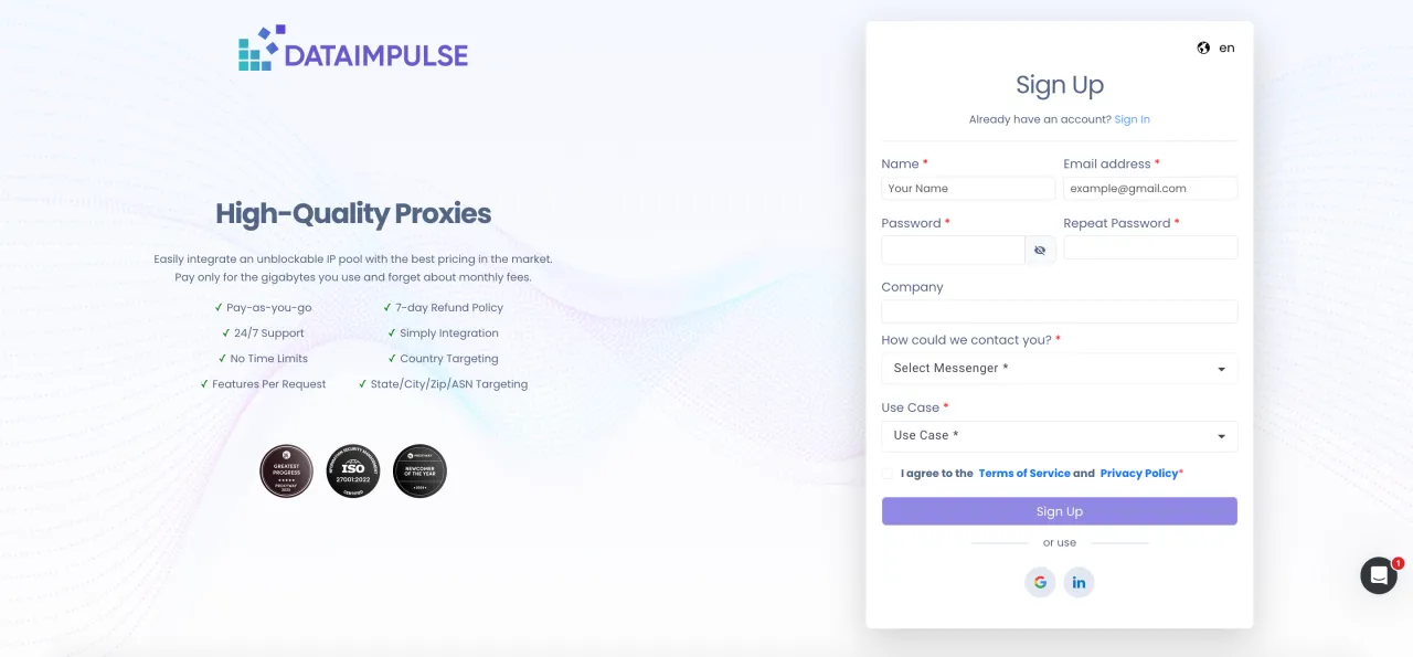 Importante: Si estás buscando proxies para múltiples cuentas, DataImpulse puede no ser la mejor opción, ya que los proxies ISP generalmente son más adecuados para este propósito.