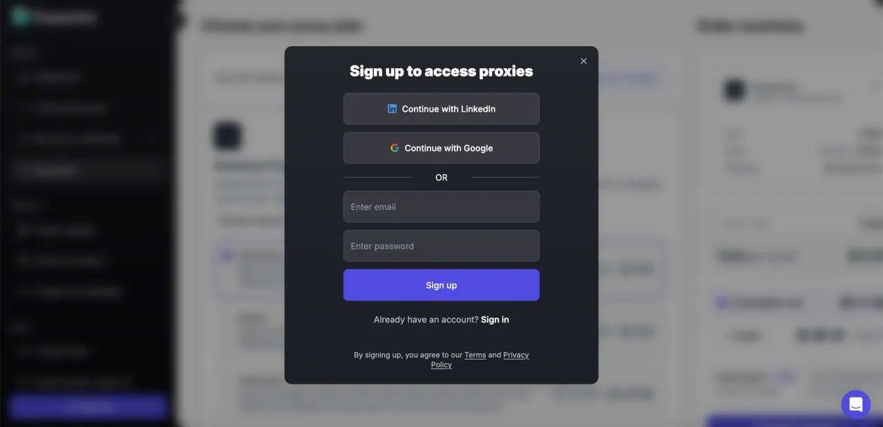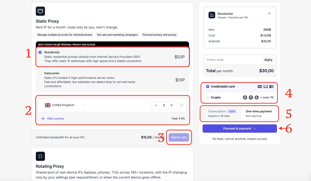 Después de seleccionar todos los parámetros necesarios y añadir los proxies al carrito, puedes proceder al pago.
