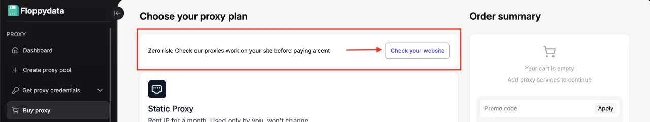 Para empezar a usar proxies, primero debes comprarlos. Desafortunadamente, Floppydata no ofrece una prueba gratuita. Sin embargo, los precios de los proxies son muy bajos y puedes adquirirlos a partir de solo 1 IP o 2 GB de tráfico. Esto permite probar sus proxies con un costo mínimo.
