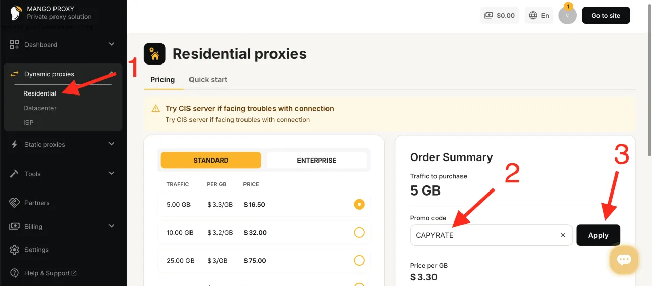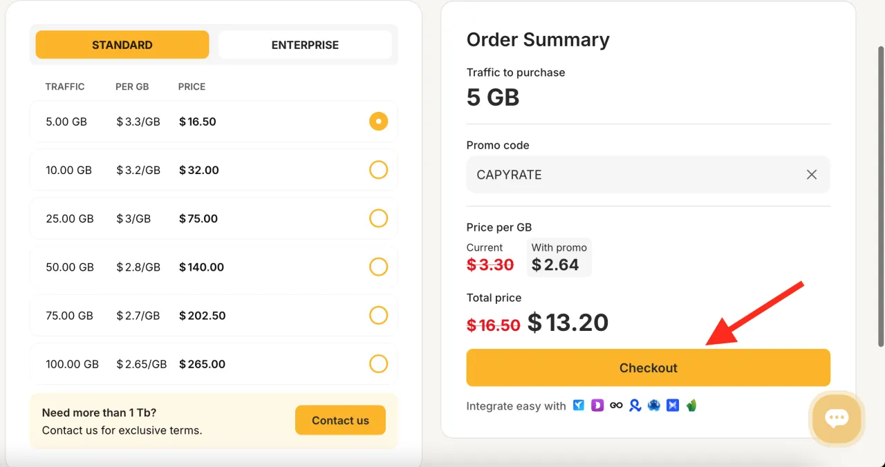 ローテーション型レジデンシャルプロキシの決済時に、登録後にプロモコードを追加できます。これを行うには、必要なトラフィック量を選択し、該当するフィールドにプロモコード「CAPYRATE」を入力してください。