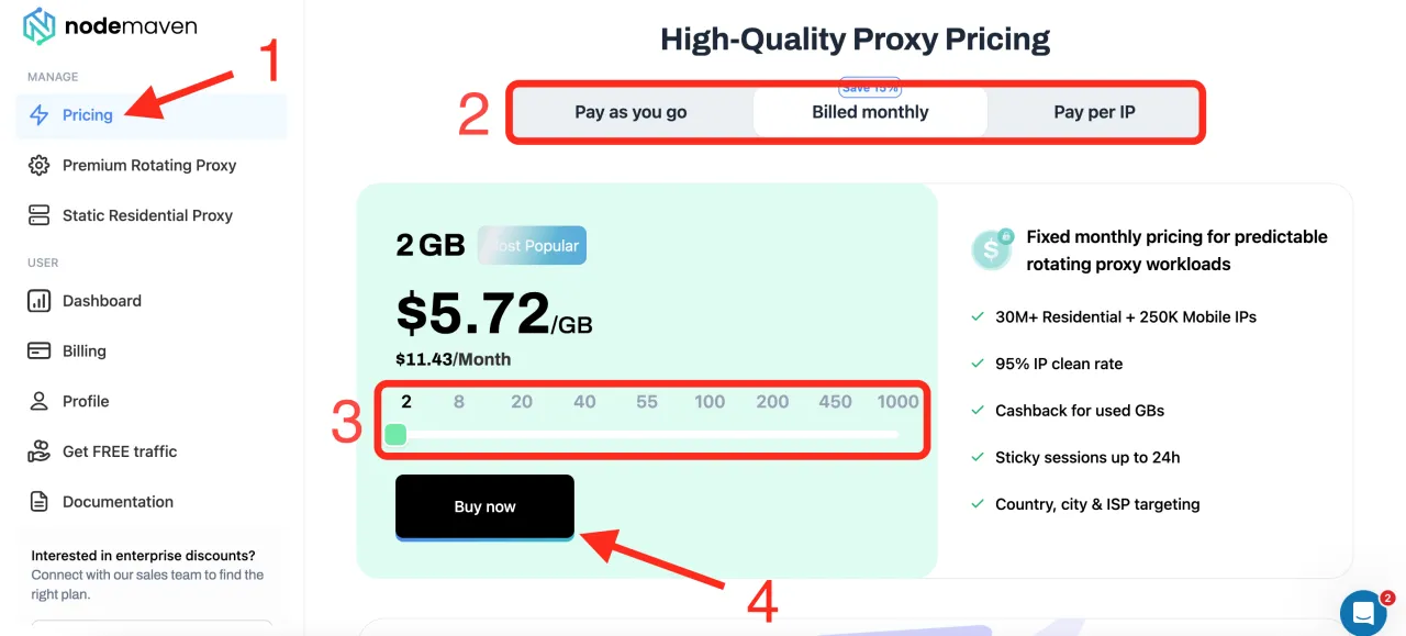 登録後、マイアカウントで"Pricing"メニュー項目をクリックします。この段階で、必要なプロキシの種類と関連パラメータ(ローテーションプロキシの場合はトラフィック量、静的プロキシの場合は期間、数量、プロトコル、国)を選択します。