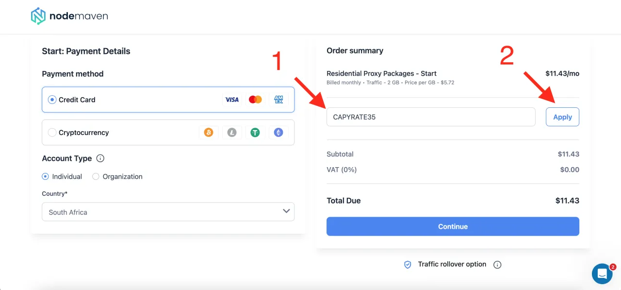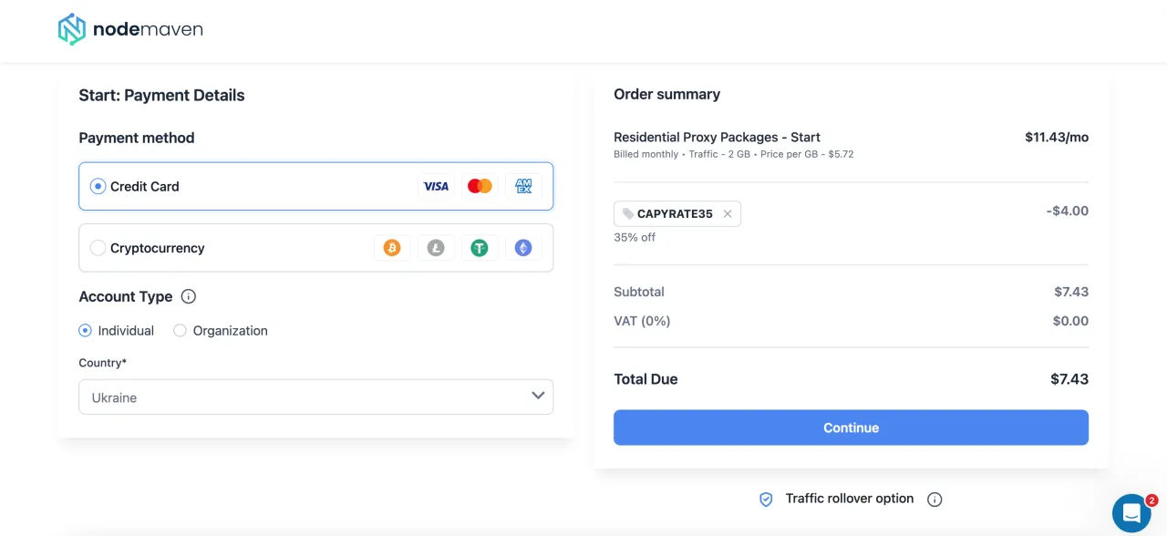 支払いページにリダイレクトされます。この段階で、クーポン(プロモコード)を入力する欄が表示されます。プロキシの種類に応じて適切なプロモコードを選ぶ必要があります。静的レジデンシャルプロキシを購入する場合は、プロモコード CAPYRATE40 を使用して40%割引を受けられます。ローテーションプロキシが必要な場合は、クーポン CAPYRATE35 を入力して35%割引を受けられます。