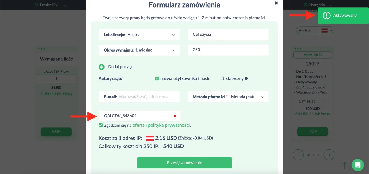 Proces zastosowania kodu promocyjnego na stronie Proxy-Seller nie różni się i jest taki sam niezależnie od tego, czy jesteś zarejestrowany(-a), czy nie, a także jest identyczny dla wszystkich typów proxy.