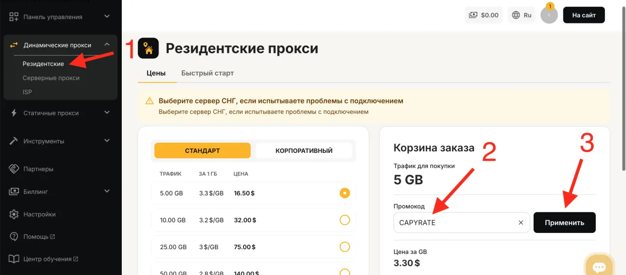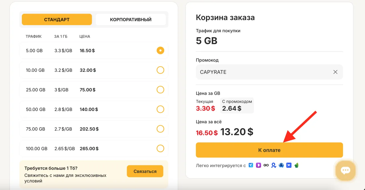 Вы можете добавить промокод после регистрации при оформлении заказа на ротационные резидентные прокси. Для этого выберите нужный объём трафика и введите промокод CAPYRATE в соответствующее поле.