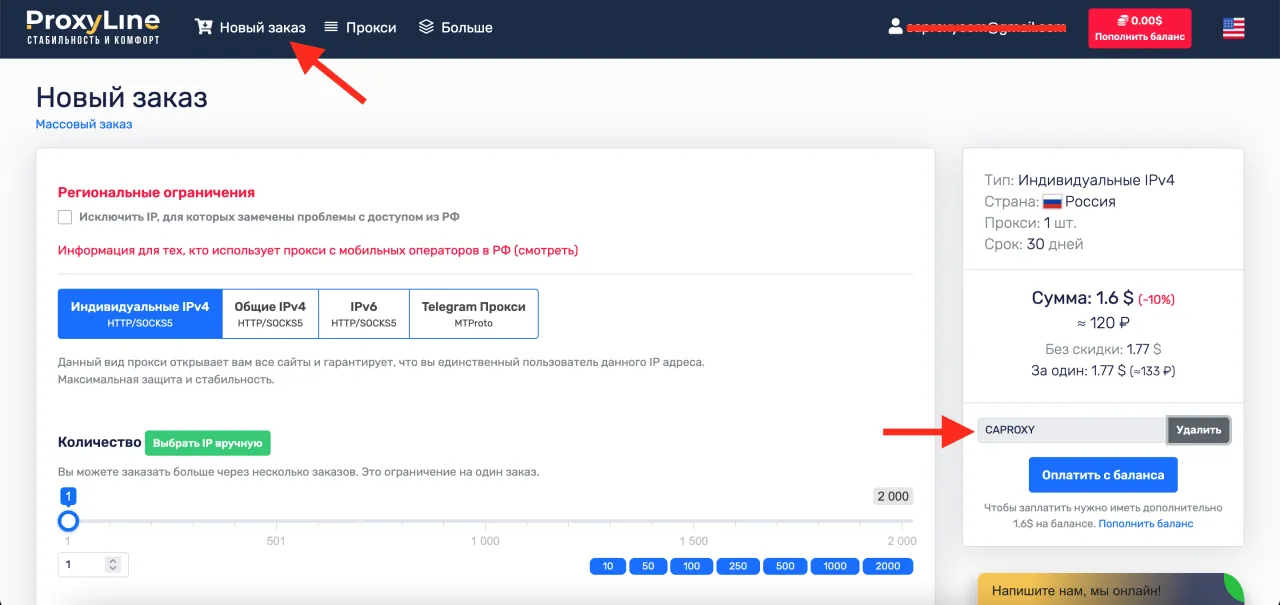 С ProxyLine вы можете совершить покупку как без регистрации, так и через личный кабинет после регистрации. Давайте рассмотрим оба варианта и покажем, где вводить купон (промокод), чтобы получить скидку 10% на заказ.