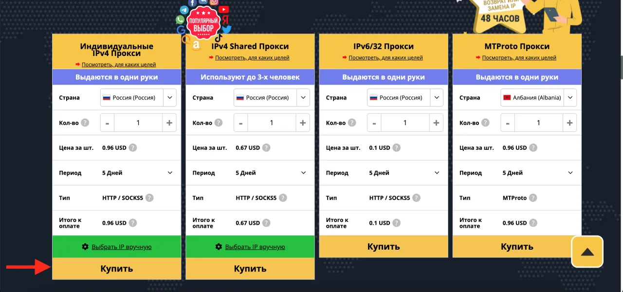 Для этого немного прокрутите главную страницу вниз, и вы увидите цены по типам прокси. Прямо на главной странице выберите все необходимые параметры для нужного типа прокси (количество, период покупки и страну), затем нажмите кнопку "Купить".