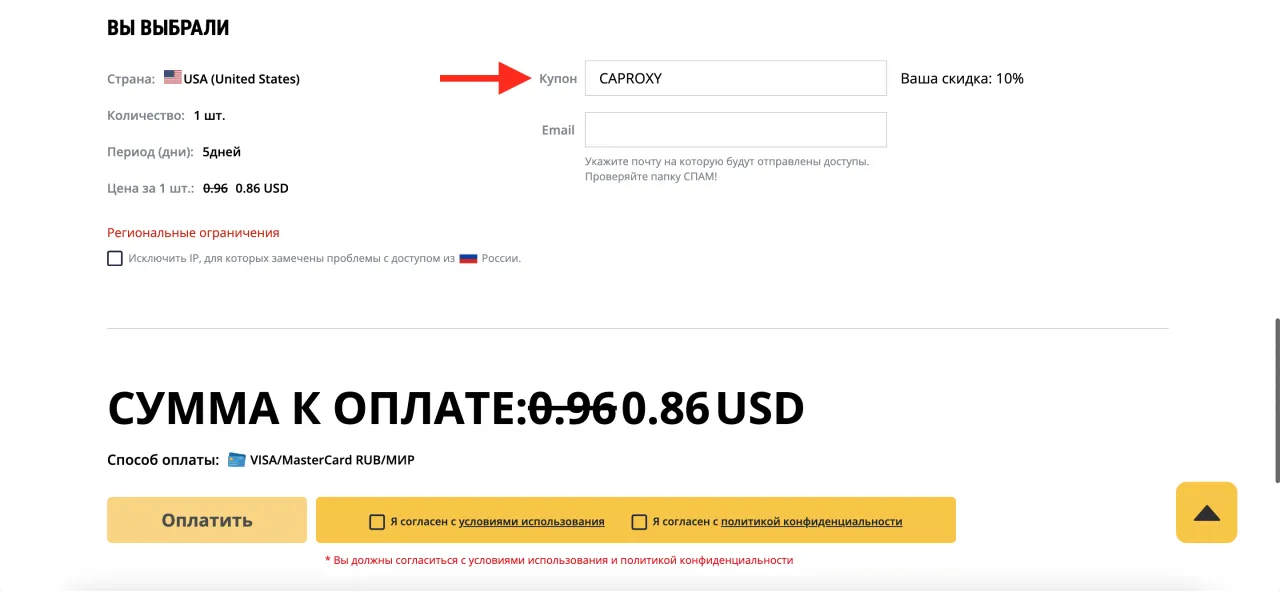 Рядом с логотипом нажмите вкладку "Новый заказ", и откроется страница покупки прокси. Выберите все необходимые параметры (тип прокси, количество, период покупки и страну). Затем над кнопкой покупки введите купон и примените его. Вы увидите, что итоговая сумма станет на 10% ниже после применения купона.