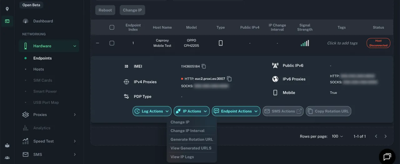 У меню "Hardware", у розділі "Endpoints", ви можете перевірити статус вашого підключеного пристрою. Також можна налаштувати зміну IP-адреси, якщо у вас є платний план. Для безкоштовного плану можна змінити IP-адресу за допомогою режиму польоту (включаючи його та вимикаючи).