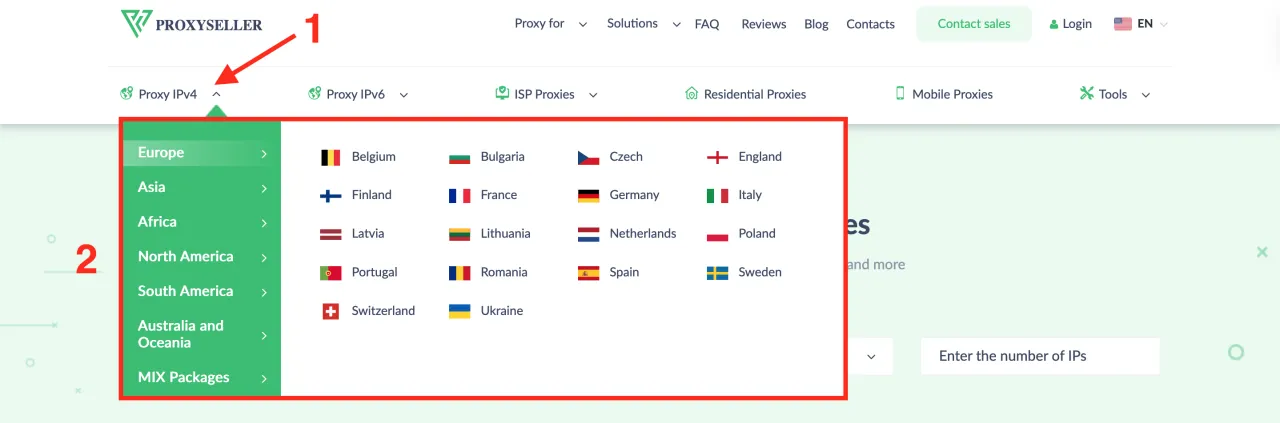 Для їх придбання наведіть курсор на IPv4 або IPv6 в меню і виберіть потрібну країну. Далі виберіть кількість проксі з доступних варіантів або введіть свою кількість в лівому блоці. Після цього натисніть Купити.