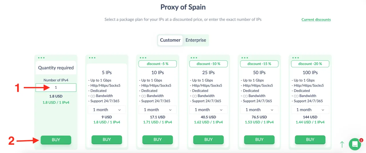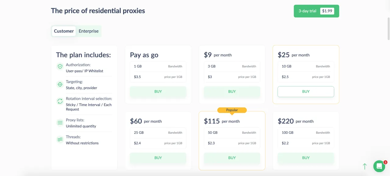 Щодо ціни, Proxy-Seller пропонує як плани з оплатою за фактом використання використання (де трафік не втрачає чинності), так і щомісячні плани з фіксованим обмеженням трафіку. Щомісячні плани більш економічні, але придбане кількість трафіку слід використати протягом 30 днів.