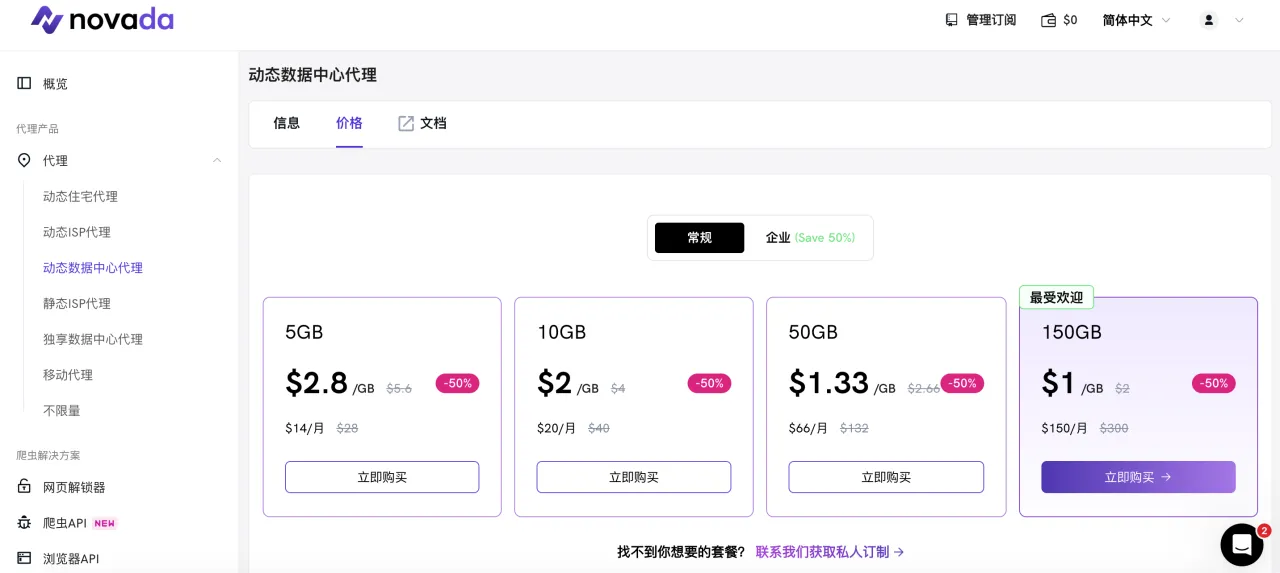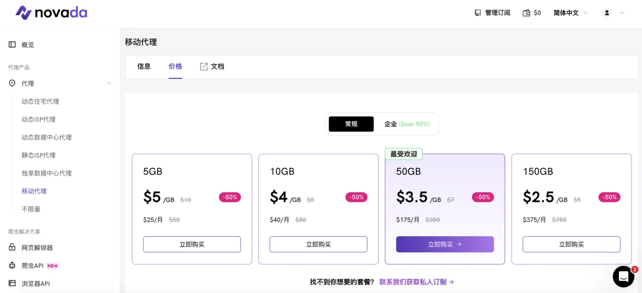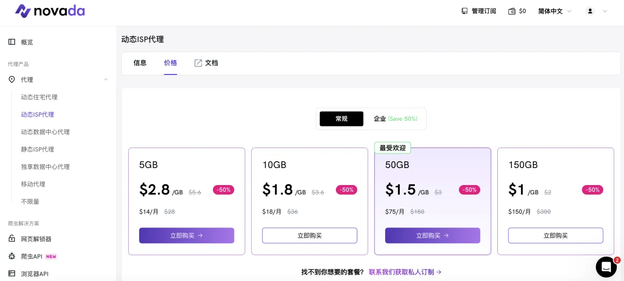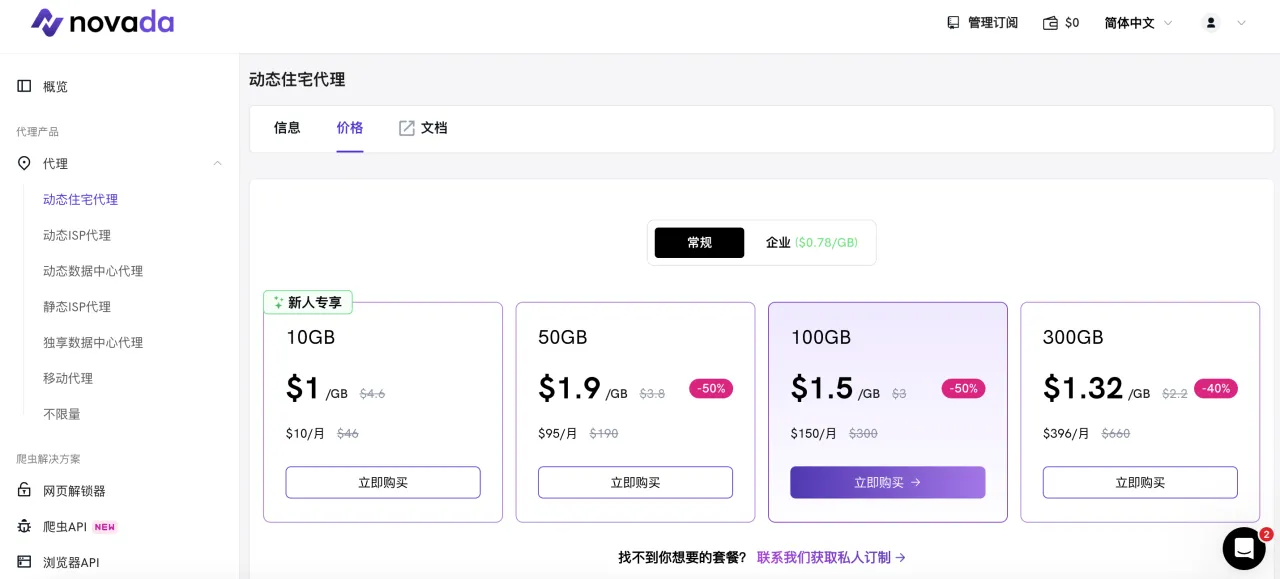 Novada提供了一项独特服务——旋转ISP代理,这在其他提供商中很少见。根据购买量,价格从每GB 2.80美元到0.65美元不等,这是个非常合适的价格,特别是对于大流量购买。