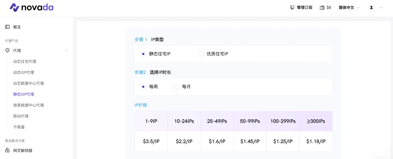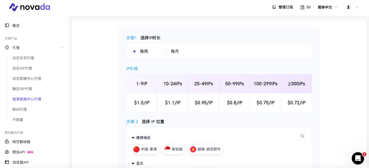 在这里的情况类似于静态ISP代理:您按IP付费并获得无限流量。Novada提供了广泛的国家选择,对于购买50个或更多IP的情况,定价特别有吸引力。
